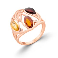 Damenring vergoldet aus 925 Silber mit Kirsch-, Cognac- und Zitronenbernstein, Gr. 17.5 mm