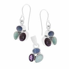 Set: Ohrringe + Anhänger aus 925er Silber mit bunten Steinen in grün-grau-lila