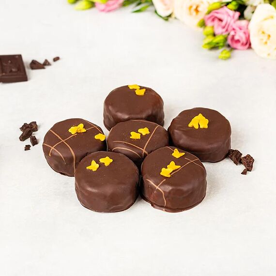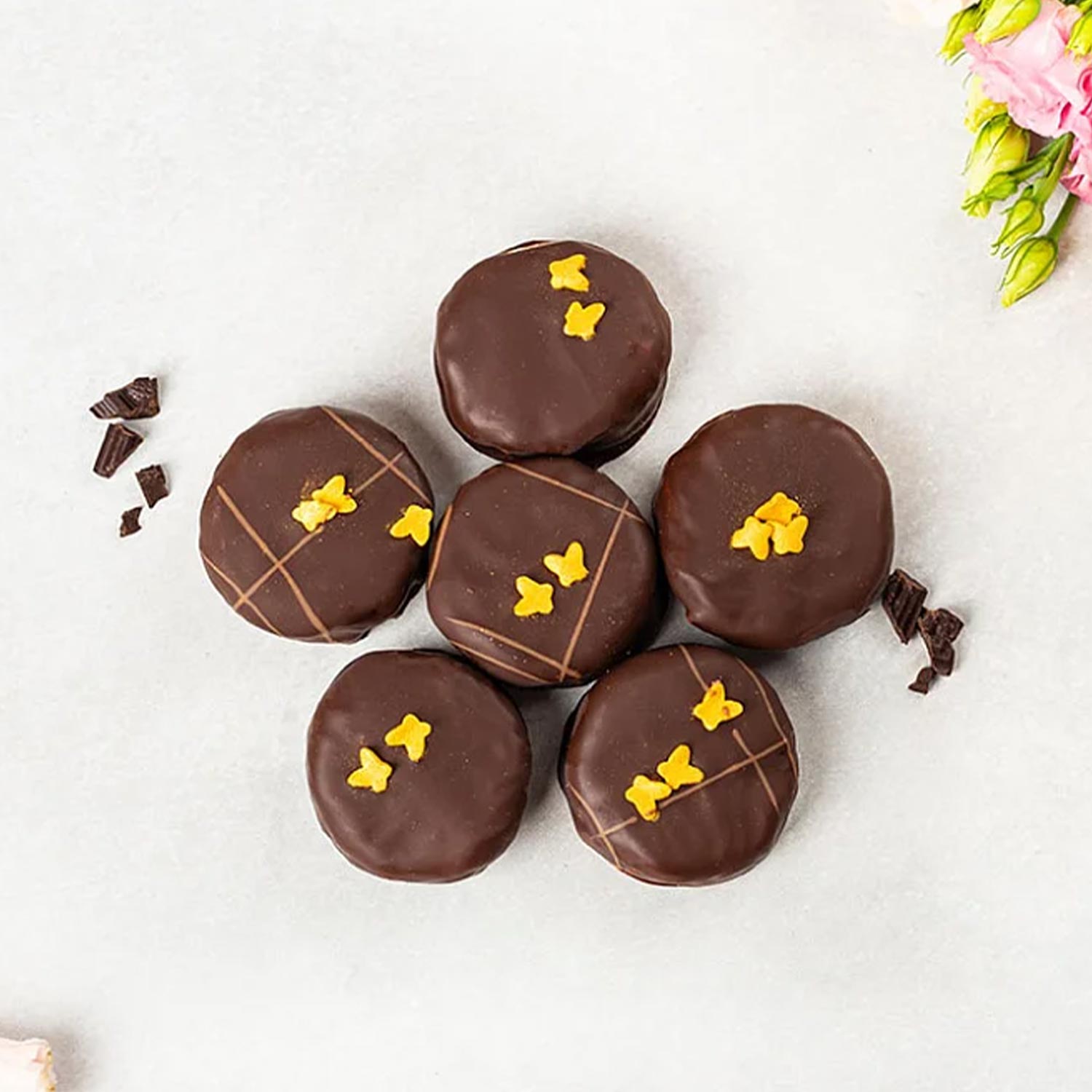 - Dekoriert mit Bitterschokolade und goldenen Zuckersternen oder Schmetterlingen