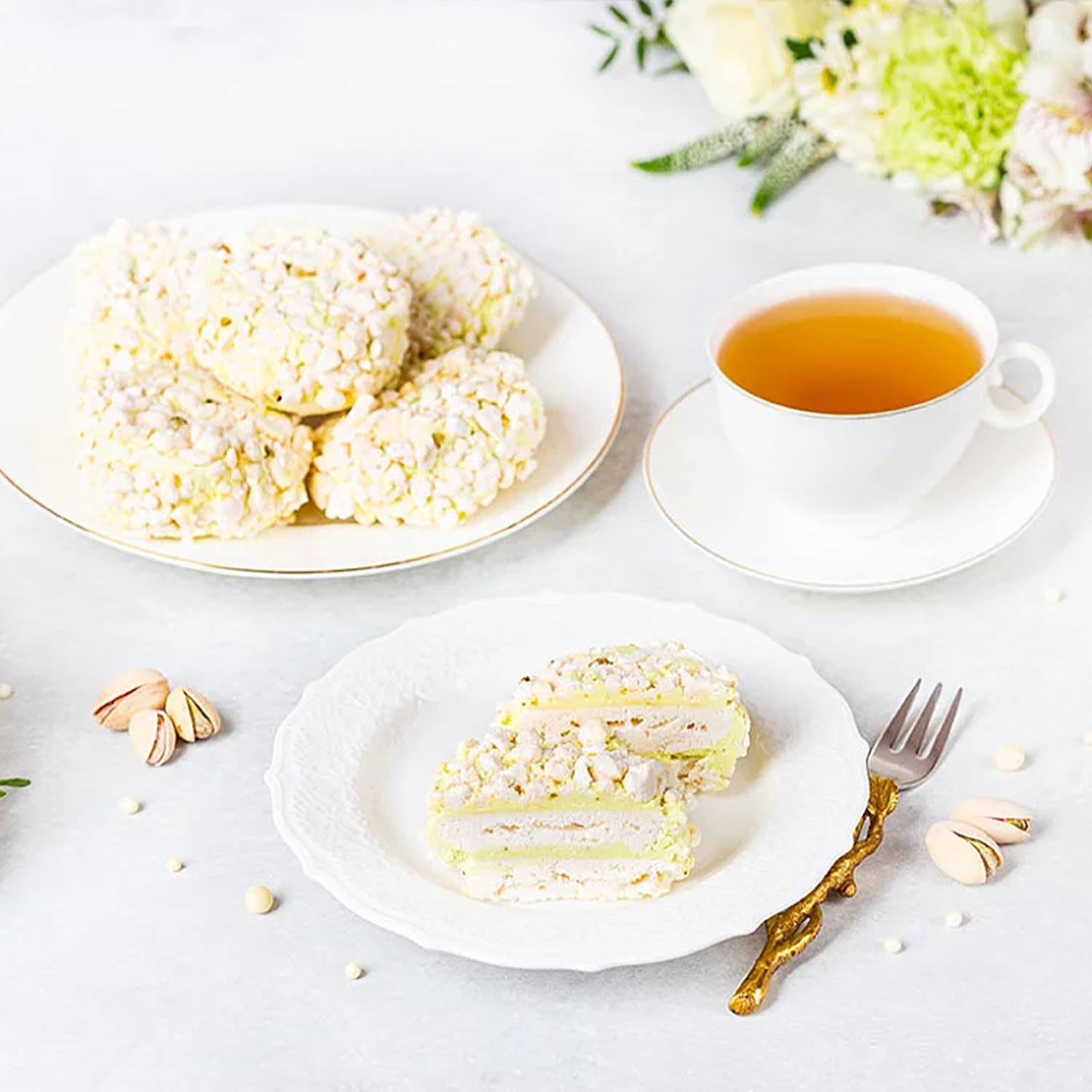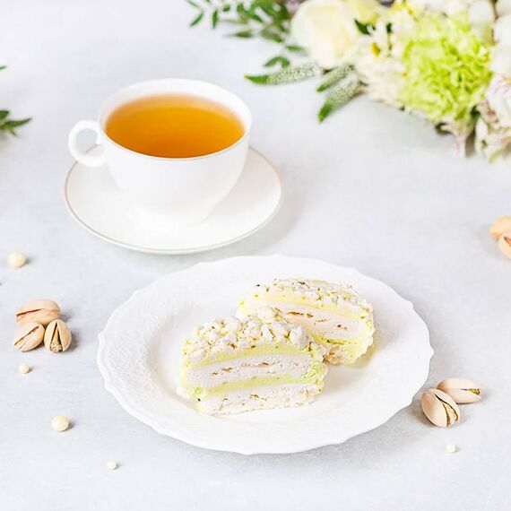 Das Palych Nuss-Baiser mit Pistazien, 200 g ist eine exquisite Kreation für Liebhaber feiner Desserts. Zwei luftige Schichten aus klassischem weißem Baiser werden durch eine cremige Füllung mit edler Pistazienpaste veredelt. Die feine Kombination aus zarter Creme und knuspriger Textur sorgt für ein einzigartiges Geschmackserlebnis. Abgerundet wird das Dessert durch eine dekorative Bestreuung mit knusprigen Baiserkrümeln und gehackten Pistazien – ein Genuss für besondere Momente.Eigenschaften: