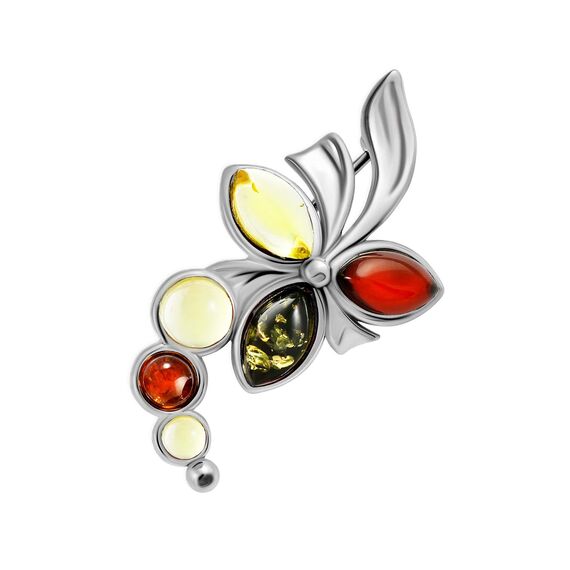 Die Kombination aus poliertem Silber und den natürlichen Farben des Bernsteins verleiht dieser Brosche eine zeitlose Eleganz. Jedes Stück ist ein Unikat, da die Bernsteine in Farbe und Muster variieren können, was die Individualität dieses Accessoires unterstreicht.