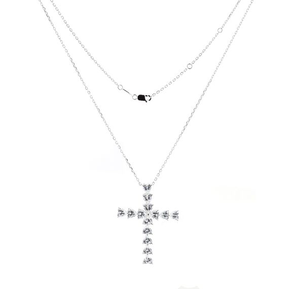 Kreuzanhänger aus 925 Silber mit herzförmigen Zirkonia-Steinen auf Silberkette