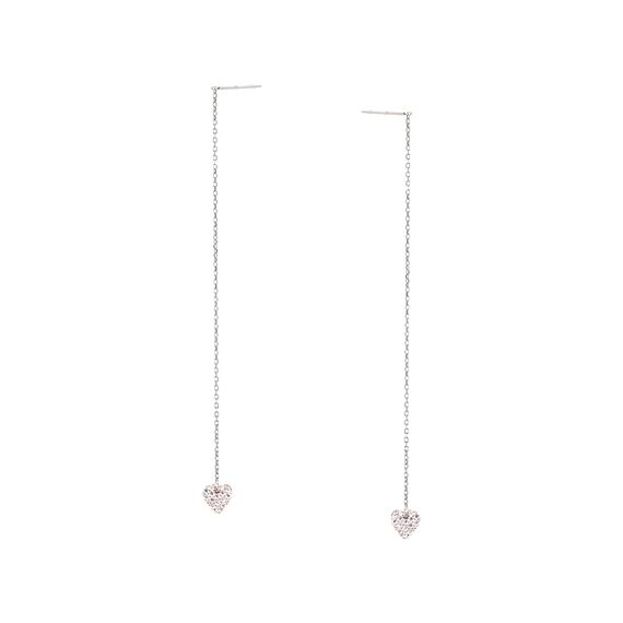Langkettige Durchzieh-Ohrringe aus 925 Silber mit Zirkonia-Steinen in Herzchenform, veredelt