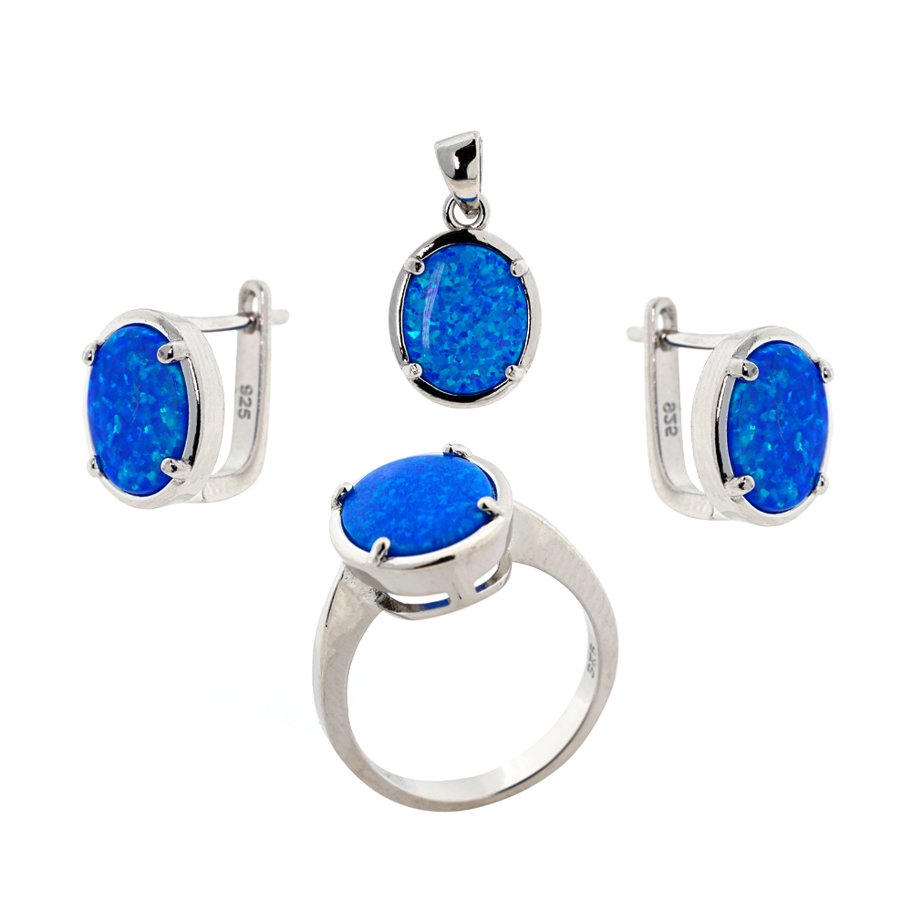 Schmuckset aus 925 Silber mit blauem Opal: Ohrringe + Anhänger + Damenring