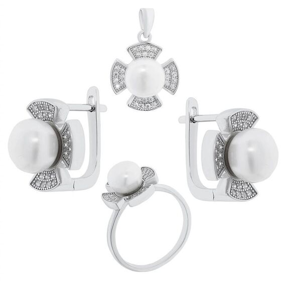 Schmuckset aus 925 Silber mit Perlen: Ohrringe + Anhänger + Damenring