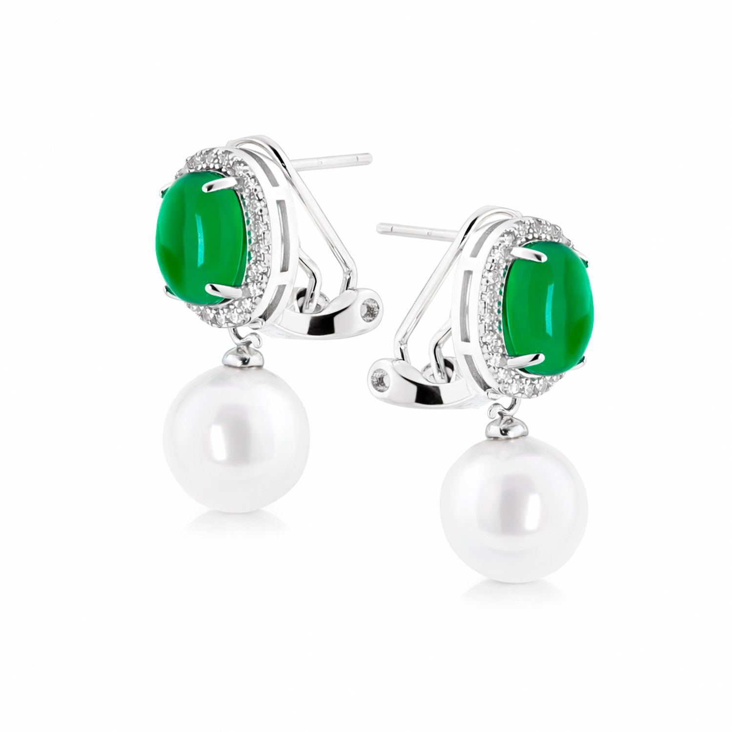 Ohrringe aus 925 Silber mit Perlen und grünen Zirkonia, umrandet mit kleinen farbenlosen Zirkonia