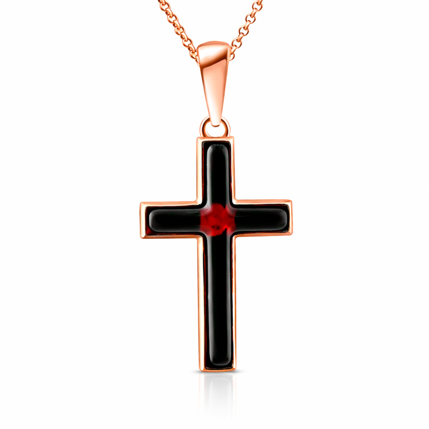 Dieser elegante Kreuzanhänger aus 925er Silber, veredelt mit edler Rosévergoldung, vereint Spiritualität und modernen Stil. Die Mitte des Kreuzes ist mit einem natürlichen Bernstein in tiefem Rot-Schwarz-Ton besetzt, der bei Lichteinfall geheimnisvoll schimmert.Das klassische Kreuzdesign wird durch die warme Ausstrahlung des Bernsteins neu interpretiert – ein Schmuckstück, das sowohl als Ausdruck des Glaubens als auch als modisches Accessoire überzeugt. Perfekt geeignet für festliche Anlässe oder den Alltag.