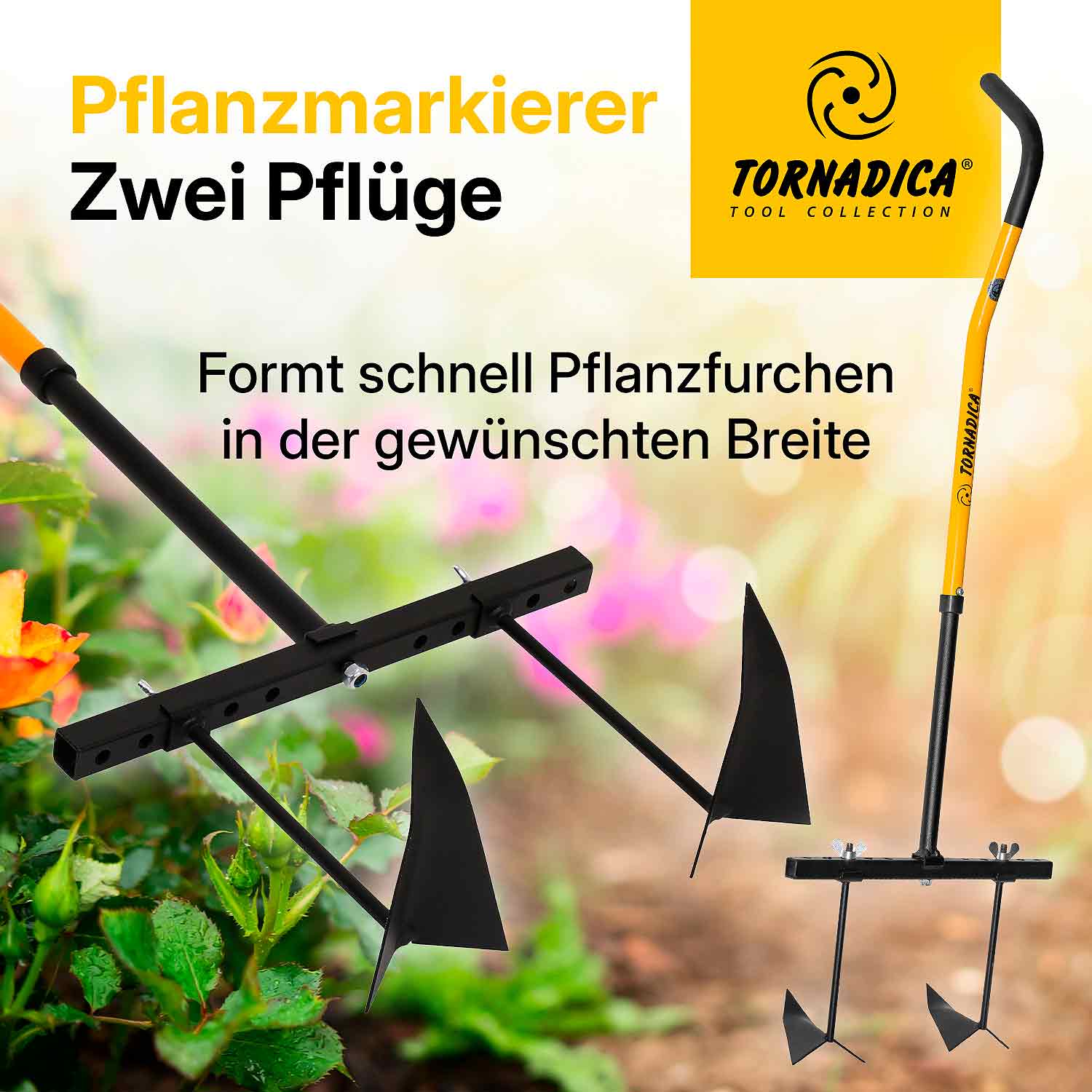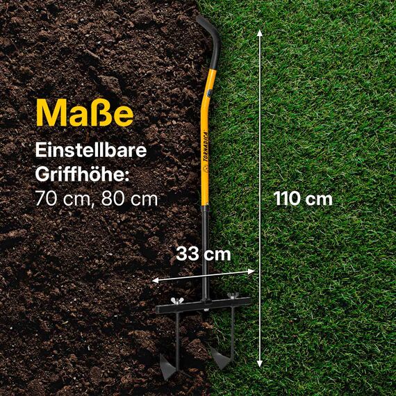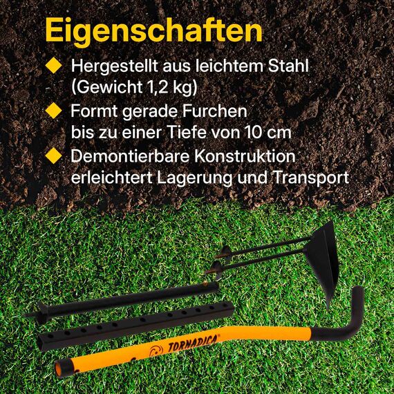 Der Tornadica-Häufler hat einen höhenverstellbaren Griff, so dass Sie mit geradem Rücken arbeiten können. Das untere Arbeitsteil lässt sich außerdem leicht in der Breite verstellen.