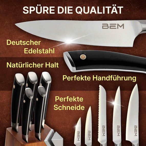 BEM Master Chef - Messer-Set 6-tlg. aus hochwertigem Edelstahl mit Messerblock und integriertem Messerschärfer