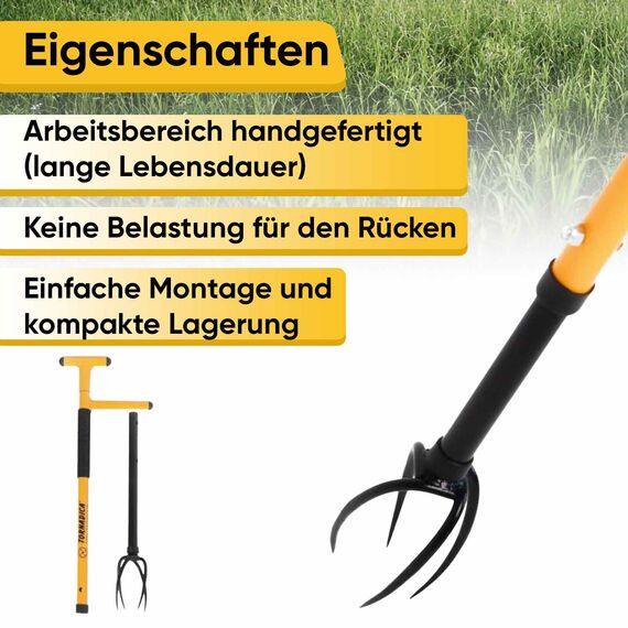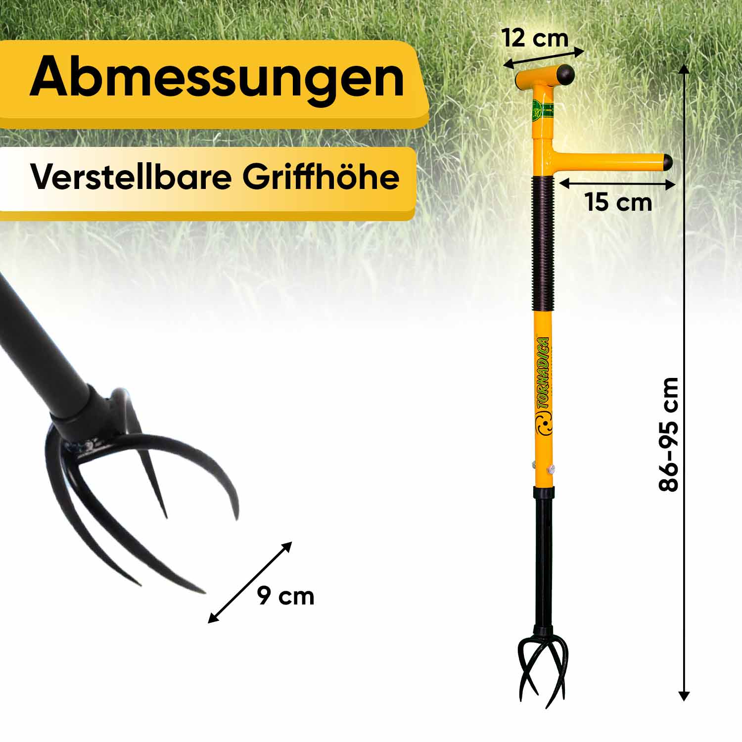 Die Gartenkralle von TORNADICA ist aus hochwertig verarbeitetem Metall gefertigt und zweifarbig lackiert. Die speziell gedrehten Krallen zur einfachen Entfernung des Unkrauts sind aus handgeschmiedetem Stahl hergestellt. Zum einfacheren Garten Unkraut entfernen, ist die Gartenkralle als leichter Unkrautentferner auf die gewünschte Körpergröße einstellbar. Auch die Grifflänge ist für eine bessere Hebelwirkung und eine einfache Handhabung zweifach verstellbar. Die TORNADICA Gartenkralle ist ein leichter Unkrautentferner und Vertikutierer für Grünflächen, der besonders pflegeleicht ist und eine lange Lebensdauer hat.