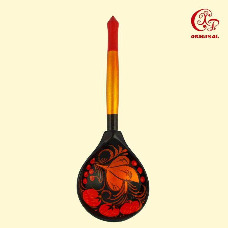 Der Löffel besteht aus natürlichem Holz und ist mit einem schützenden, lebensmittelsicheren Lack überzogen. Ideal zum Servieren von Speisen oder als dekoratives Souvenir im traditionellen russischen Stil.