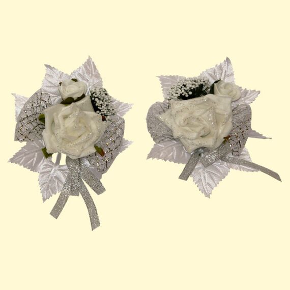 Perfekt für eine elegante Tischdekoration oder romantische Hochzeitsdetails! Jedes Set besteht aus zwei kleinen Sträußen (ca. 7x11 cm) mit kunstvoll arrangierten weißen Rosen in verschiedenen Designs. Verziert mit dezentem Glitzer und silbernen Blättern, verleiht dieses Set Ihrer Hochzeit oder festlichen Veranstaltung einen glamourösen und zeitlosen Look. Die hochwertige Verarbeitung und die natürliche Anmutung der Blumen machen diese Deko zu einem Highlight für Brautjungfern, Gastgeschenke oder Tischarrangements.- Material: Kunstblumen (hochwertige Seiden- oder Polyesterrosen), Glitzerelemente, silberne Kunstblätter