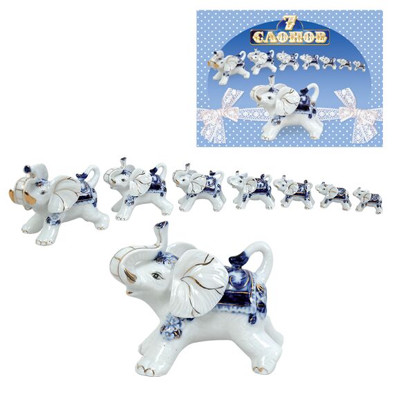 Figuren-Set 7 Elefanten blau, aus Porzellan, Figurenhöhe von 3 cm bis 9 cm