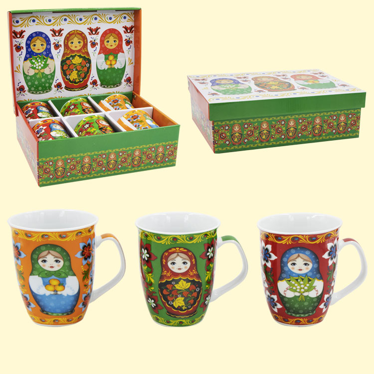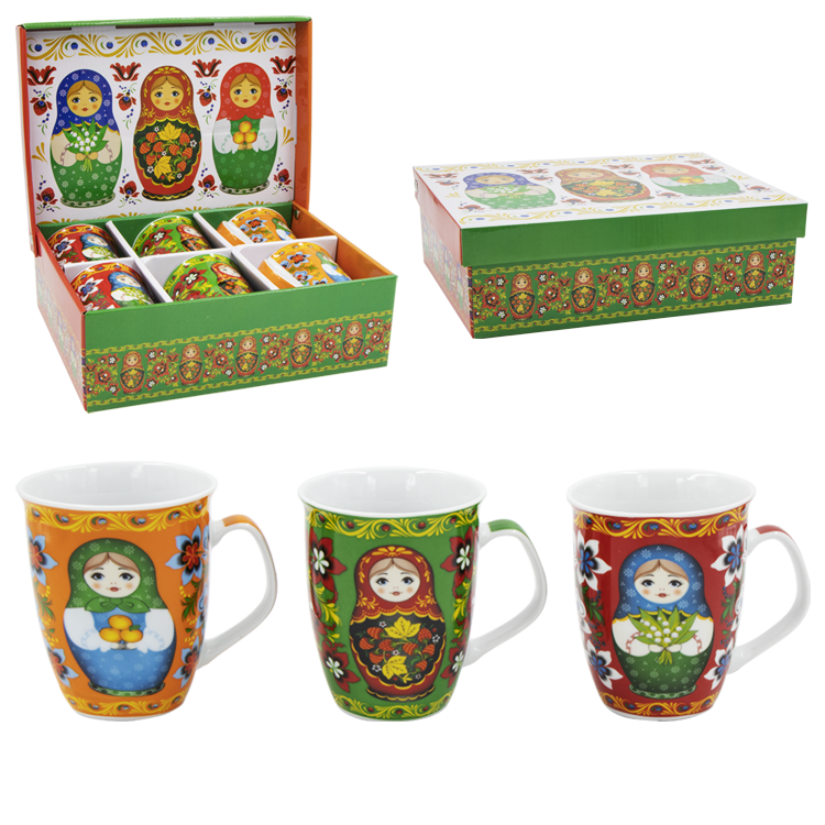 Set besteht aus 6 Porzellan Tassen je 330 ml in 3 verschiedenen Motiven mit "Matröschka"-Muster. Ist ein ideales Geschenk für alle AltersgruppenEin Set aus Matroschka-Tassen im klassischen Stil, das niemanden gleichgültig lässt, egal welcher Altersgruppe. Der Wunsch, Ihre Freunde mit einem originellen Geschenk zu überraschen oder Ihren Liebsten eine Freude zu machen. Vielleicht setzen Sie sich einfach an einen Tisch und schwelgen bei einer Tasse warmen Tees im Kreise der Familie in Nostalgie. Dann ist dieses Set genau das Richtige für Sie.