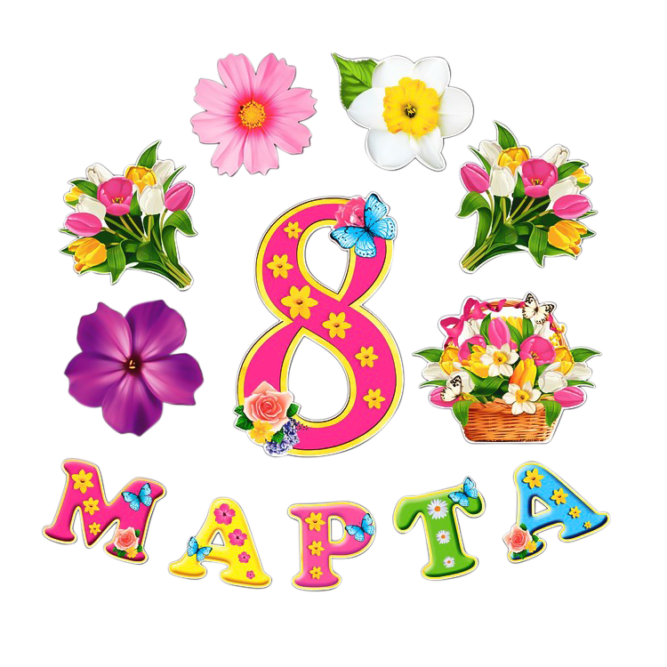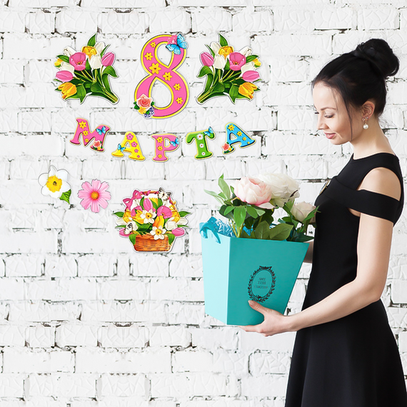 Ein Set aus Karton mit einer bunten Schrift und Blumendeko. Schmücken Sie Ihr Garten, Zuhause oder Büro zum Frauentag.Produktinformationen: