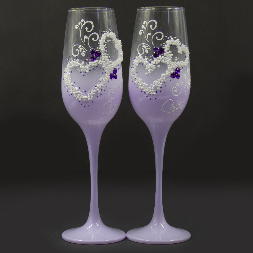 Geschenkset 2 Hochzeitsgläser, weiße Herzen auf Violet, 23,5 cm