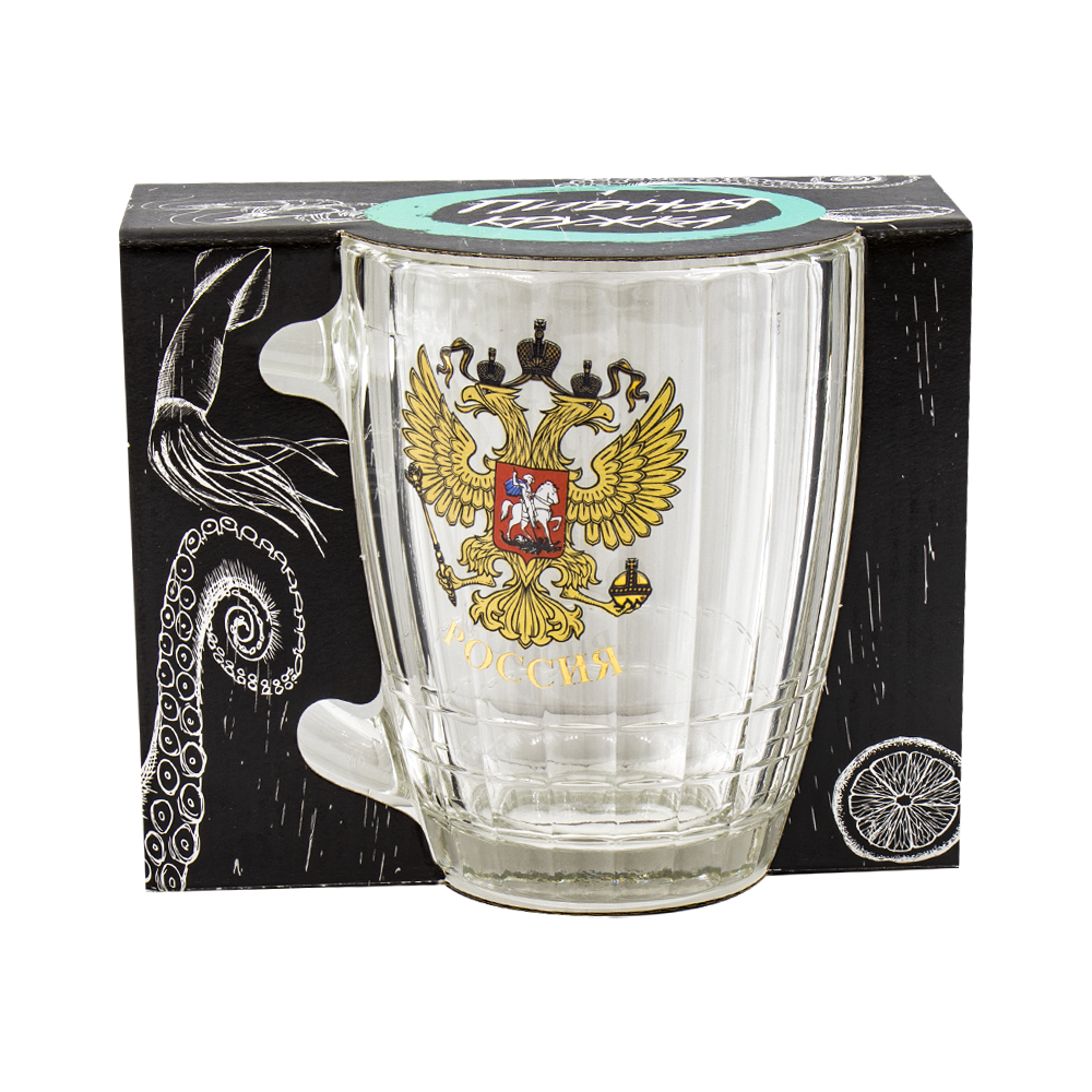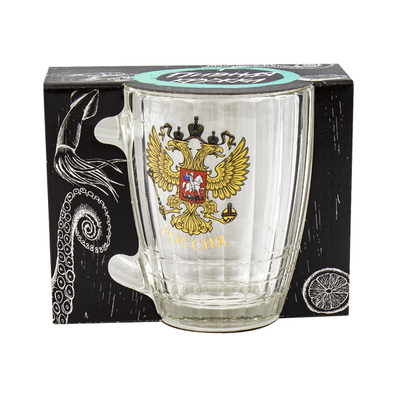 Nostalgie Bierkrug aus Glas mit Schriftzug "Rossia" und einem Wappen der Russischen Föderation. Ideal als Geschenk und für Bierliebhaber.
