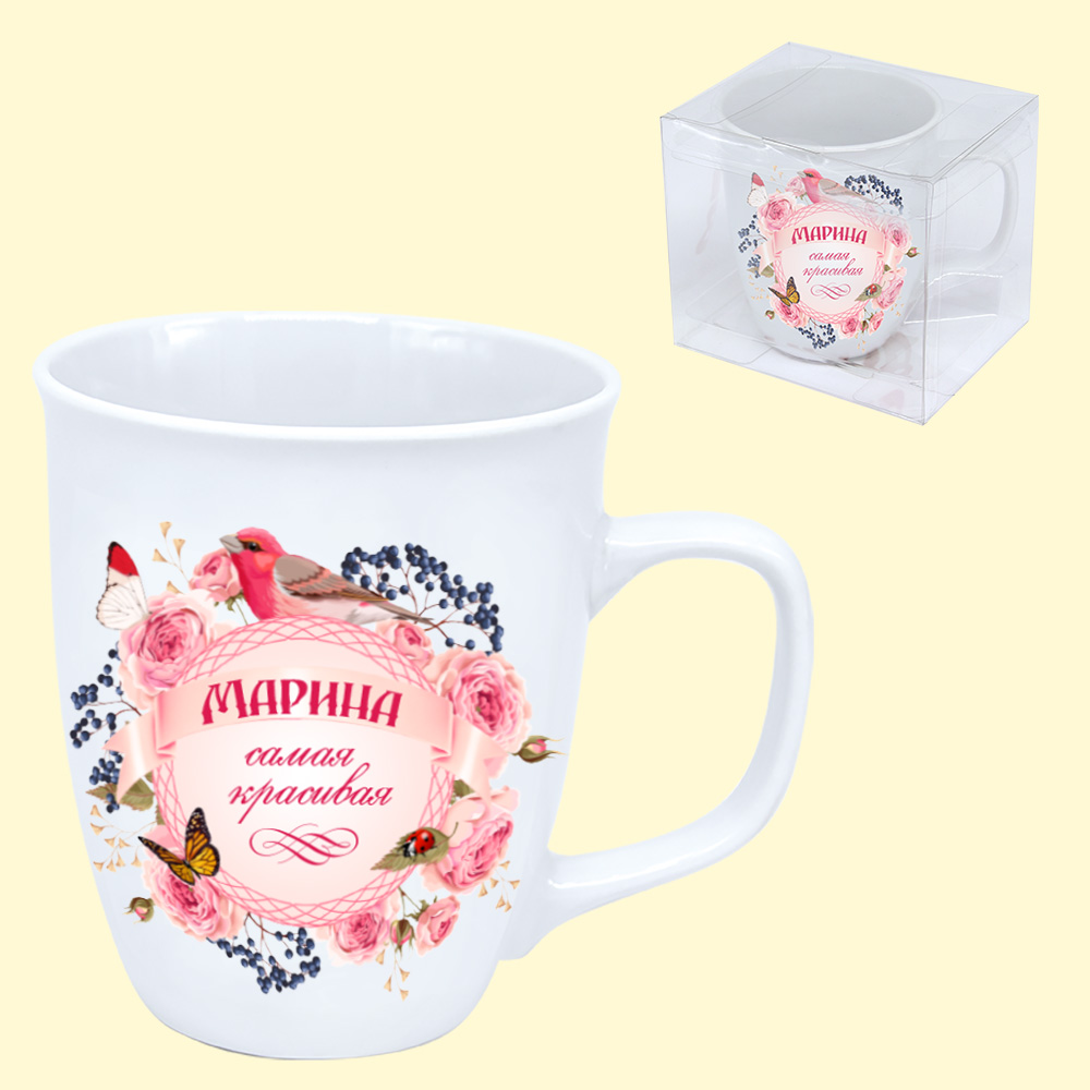 Der Becher ist aus umweltfreundlichem, hochwertigem Porzellan mit feinem Glanz gefertigt. Er hat ein attraktives thematisches Design in Form eines Schriftzuges auf russisch "Marina ist die Allerschönste".Dieser stylische Becher ist ideal für den täglichen Bedarf - ob im Büro oder Zuhause.