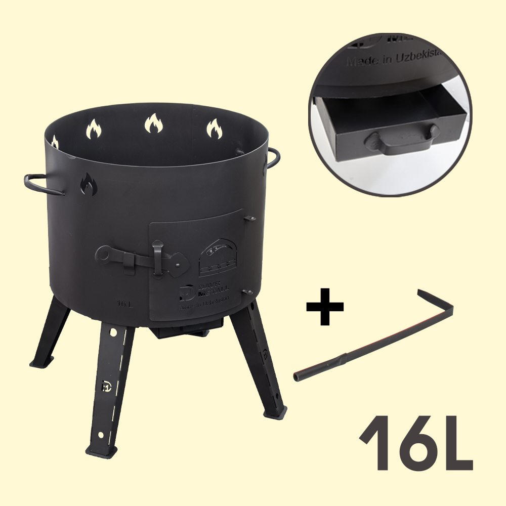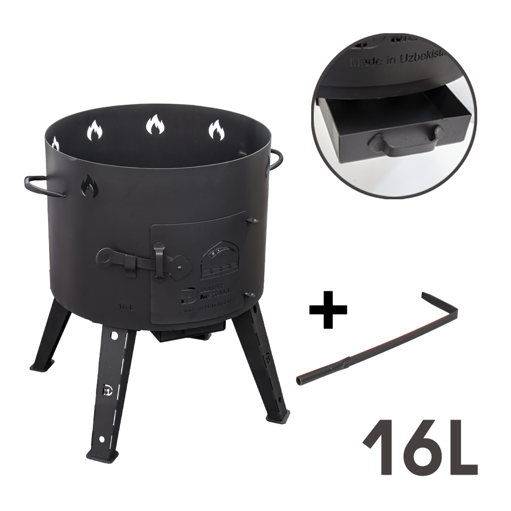 Uchag ist für die sichere und schnelle Kochen von Lebensmitteln im Freien in einem Kessel, Camping Kessel mit maximalem Komfort konzipiert. Das Produkt ist ein Metall-Zylinder-Gehäuse, das abnehmbare Beine, Tür, Asche-Schublade, Schürhaken umfasst. Dank der optimalen Wandstärke (2 mm) ist die Möglichkeit der Verformung der Produktwände ausgeschlossen. Eine hitzebeständige Beschichtung verhindert die Bildung von Rost und schützt vor Ruß.