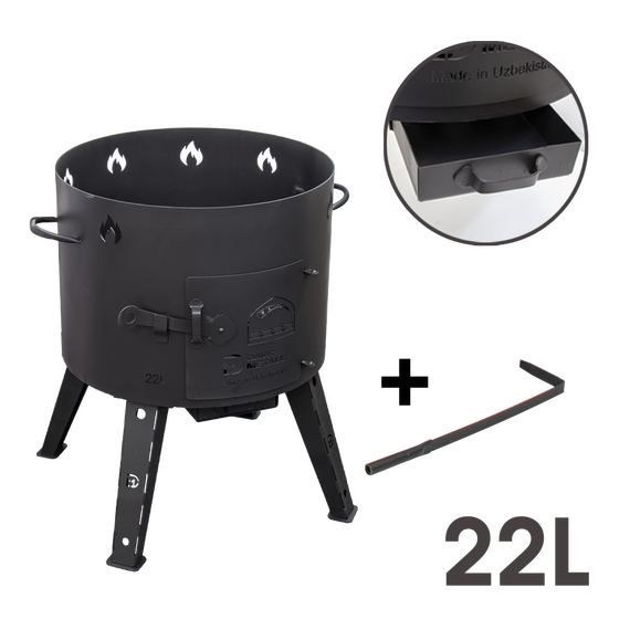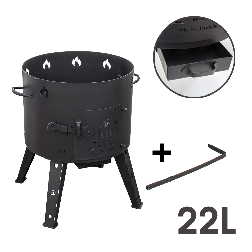 Uchag ist für die sichere und schnelle Kochen von Lebensmitteln im Freien in einem Kessel, Camping Kessel mit maximalem Komfort konzipiert. Das Produkt ist ein Metall-Zylinder-Gehäuse, das abnehmbare Beine, Tür, Asche-Schublade, Schürhaken umfasst. Dank der optimalen Wandstärke (2 mm) ist die Möglichkeit der Verformung der Produktwände ausgeschlossen. Die hitzebeständige Beschichtung verhindert die Bildung von Rost und schützt vor Ruß.