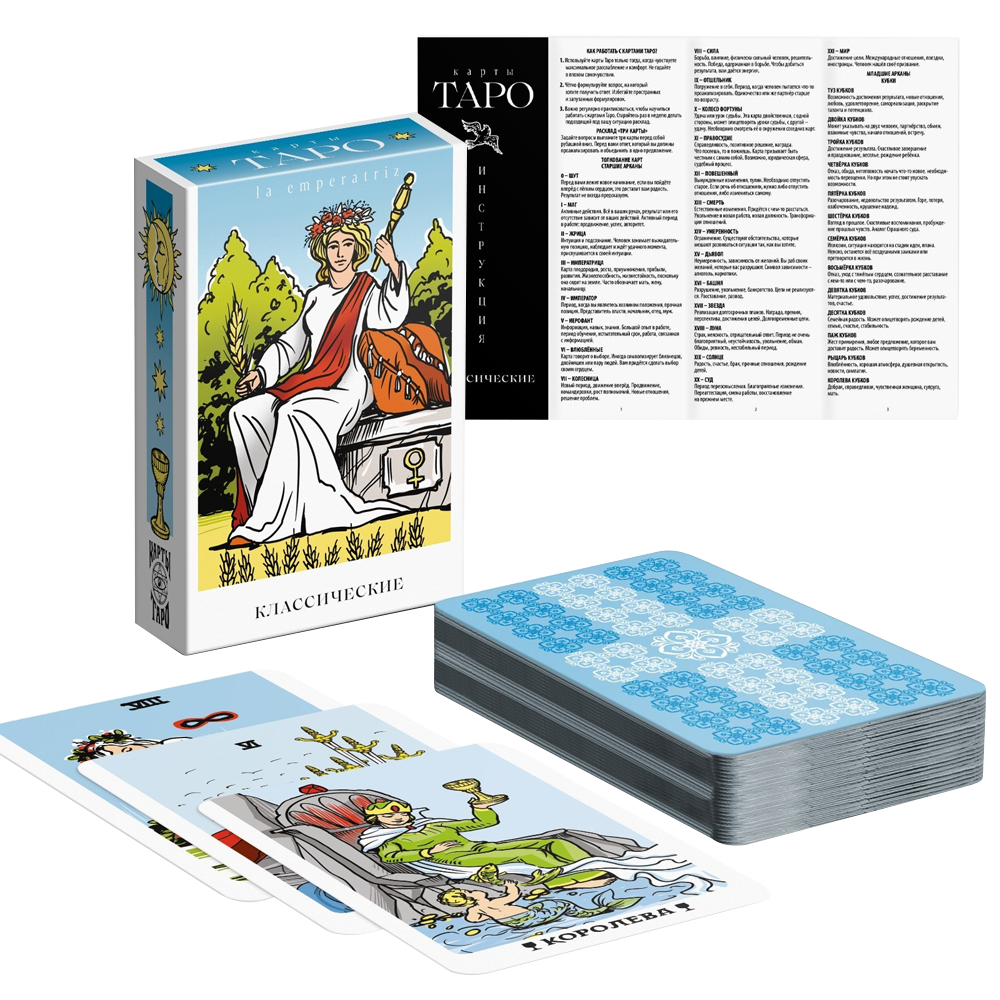 Vor Ihnen liegt ein klassisches Tarot-Deck, das die Erfahrungen aus der Vergangenheit, unserer Gegenwart und der Zukunft vereint. Dies ist eines der beliebtesten Decks, das auf der Entwicklung des britischen Mystikers, Okkultisten und Freimaurers Arthur Edward Waite basiert. Es wird Ihnen helfen, Antworten auf alle Fragen zu finden, die Sie haben. Alles, was bleibt, ist, sie zu stellen!