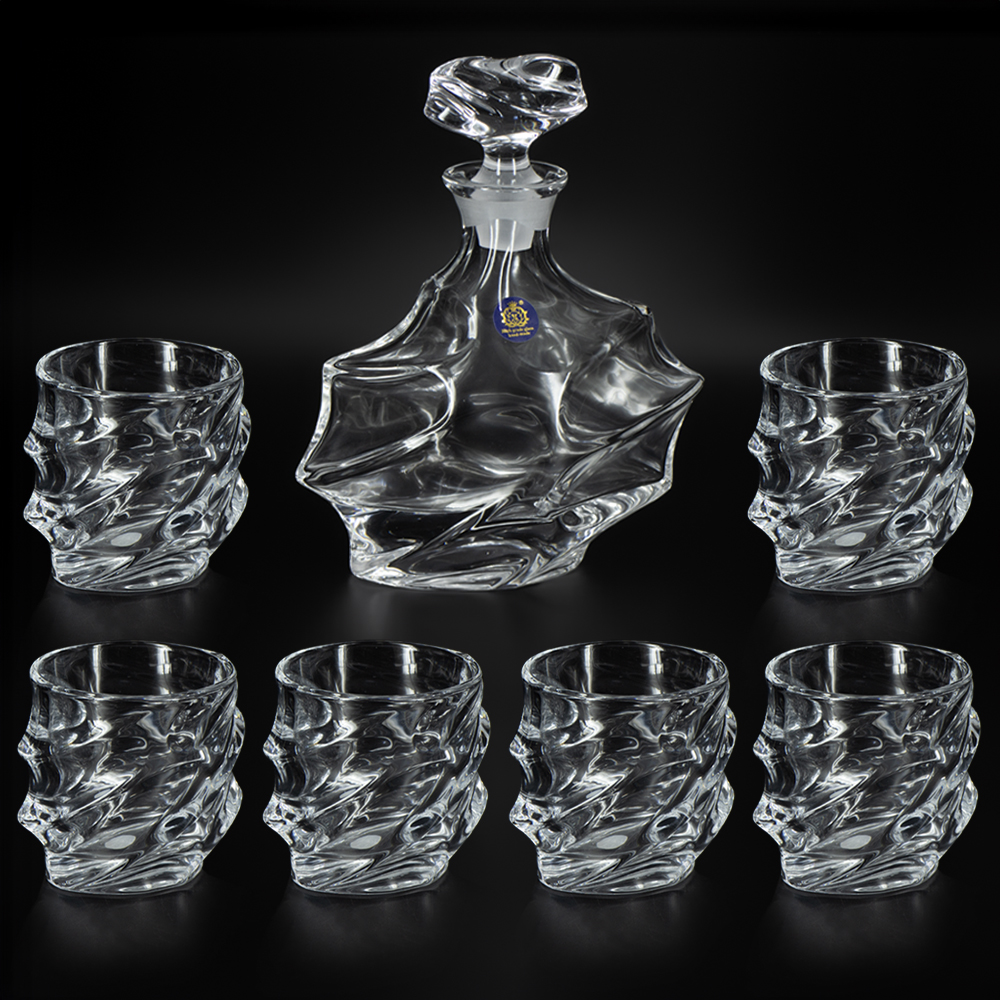 Das Whisky-Set ist aus Glas in modernem Design gefertigt. Die geschwungenen Facetten erzeugen einen optischen Effekt und verleihen dem Produkt ein raffiniertes Aussehen. Das Set besteht aus einem 800 ml Korkenzieher und 6 Gläsern zu je 300 ml.