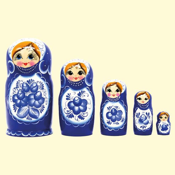 Die Matrjoschka Gzhel groß M5, ca. 18 cm ist ein kunstvoll handgefertigtes Set aus 5 ineinander verschachtelten Puppen. Die traditionelle blaue und weiße Gzhel-Malerei verleiht der Matrjoschka ein elegantes und authentisches Aussehen. Dieses hochwertige Produkt ist perfekt als Geschenk oder dekoratives Element, das russische Kultur und Handwerkskunst widerspiegelt.