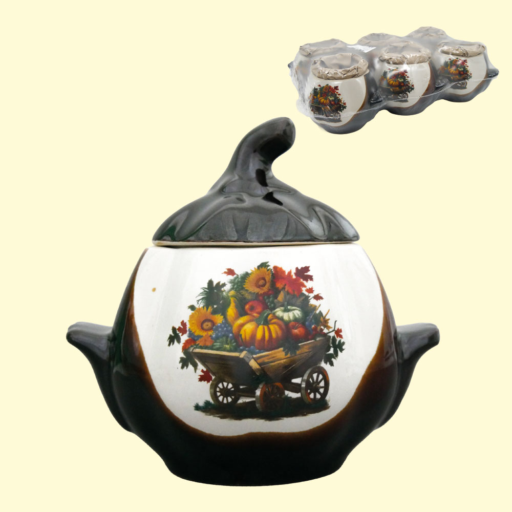 Backtopf Kürbis, weiß-braun mit Henkeln, 0,75 l, mit Wagen-Dekor (Set mit 6 Töpfen)