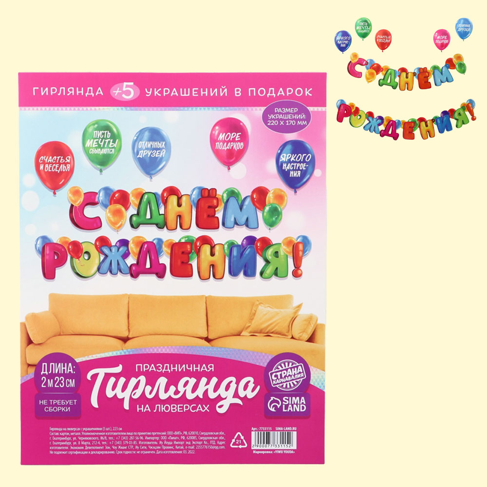 Girlande mit Ösen und Dekorationen, 5 Stück, С Днём рождения!, bunt, Länge 223 cm