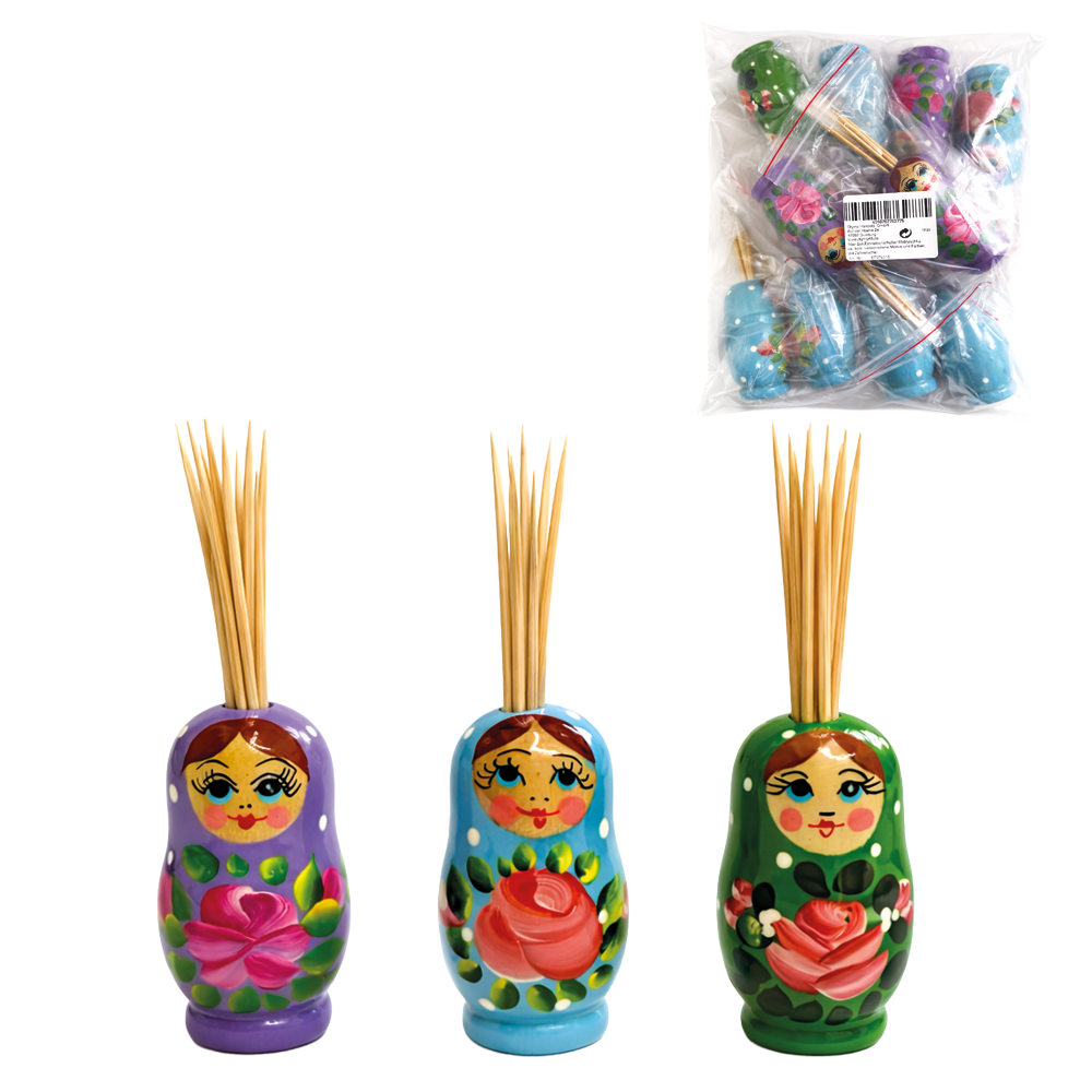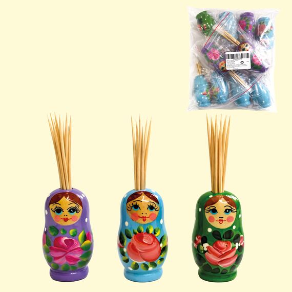 Zahnstocherhalter Matrjoschka ca. 6 cm, verschiedene Motive und Farben, mit Zahnstochern, Set 10 Stk
