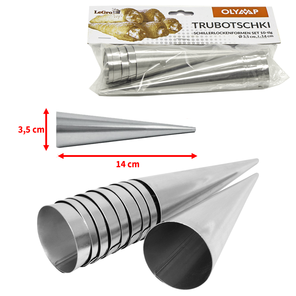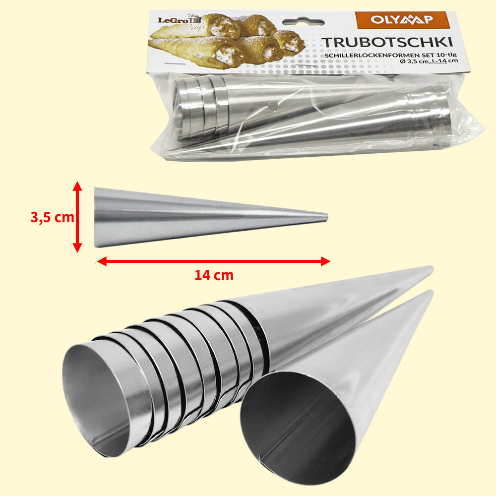 Das Set besteht aus 10 konischen Formen. Sie sind sehr einfach zu bedienen: Wickeln Sie einfach ein kleines Stück Teig um eine Stahlform und legen Sie es in den Ofen. Wenn die aufgeblasenen Röhrchen fertig sind, kühle sie ab und fülle sie mit einer süßen Füllung deiner Wahl. Die köstlichsten Kuchen werden mit einem Vanillepudding oder einer Schlagsahne erhalten.