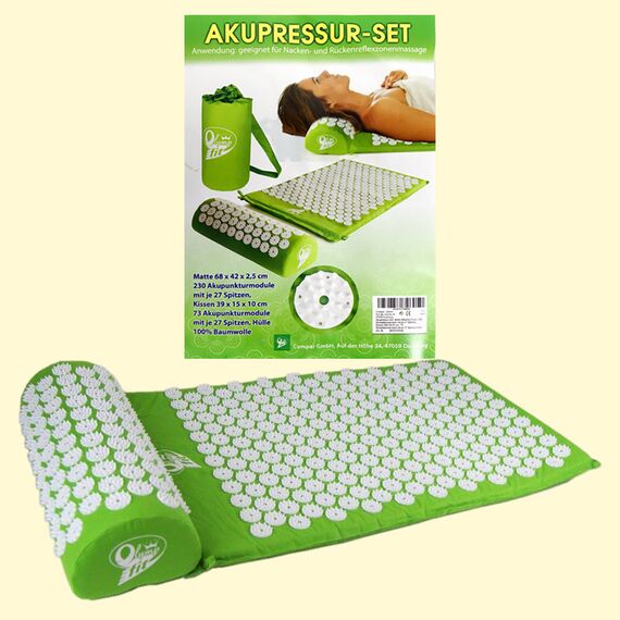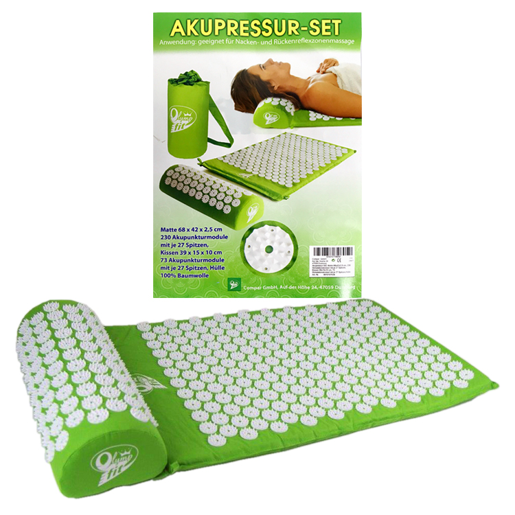 Dieses Massage Set besteht aus einer schmucken Nadelreizmatte und einem schicken Nackenmassage-Kissen, auf denen mehrere Rosetten mit jeweils 27 Kunststoffspitzen angebracht sind. Regelmäßige Anwendung wirkt wohltuend entspannend. Das Massage-Set wird in einer praktischen Tragetasche mit Gurt geliefert und kann schnell aufgerollt werden, um es platzsparend zu verstauen oder zu transportieren. Nadelreizmatte und Nackenkissen haben einen weichen Schaumstoffkern, der schmiegsame Bezug besteht aus 100% Baumwolle und ist waschbar. Gewicht: 220 g. Mate: 230 Stimulationskreisel mit je 27 Spitzen. Kiseen: 73 Stimulationskreisel mit je 27 Spitzen