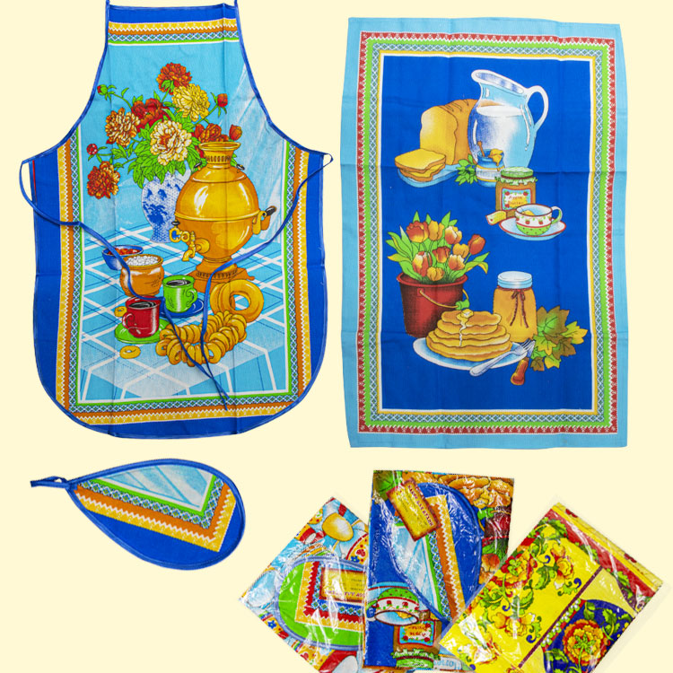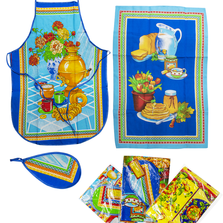 Küchen-Set 3-Tlg. (Schürze + Topflappe + Handtuch) , verschiedenes Design, 100% Baumwolle