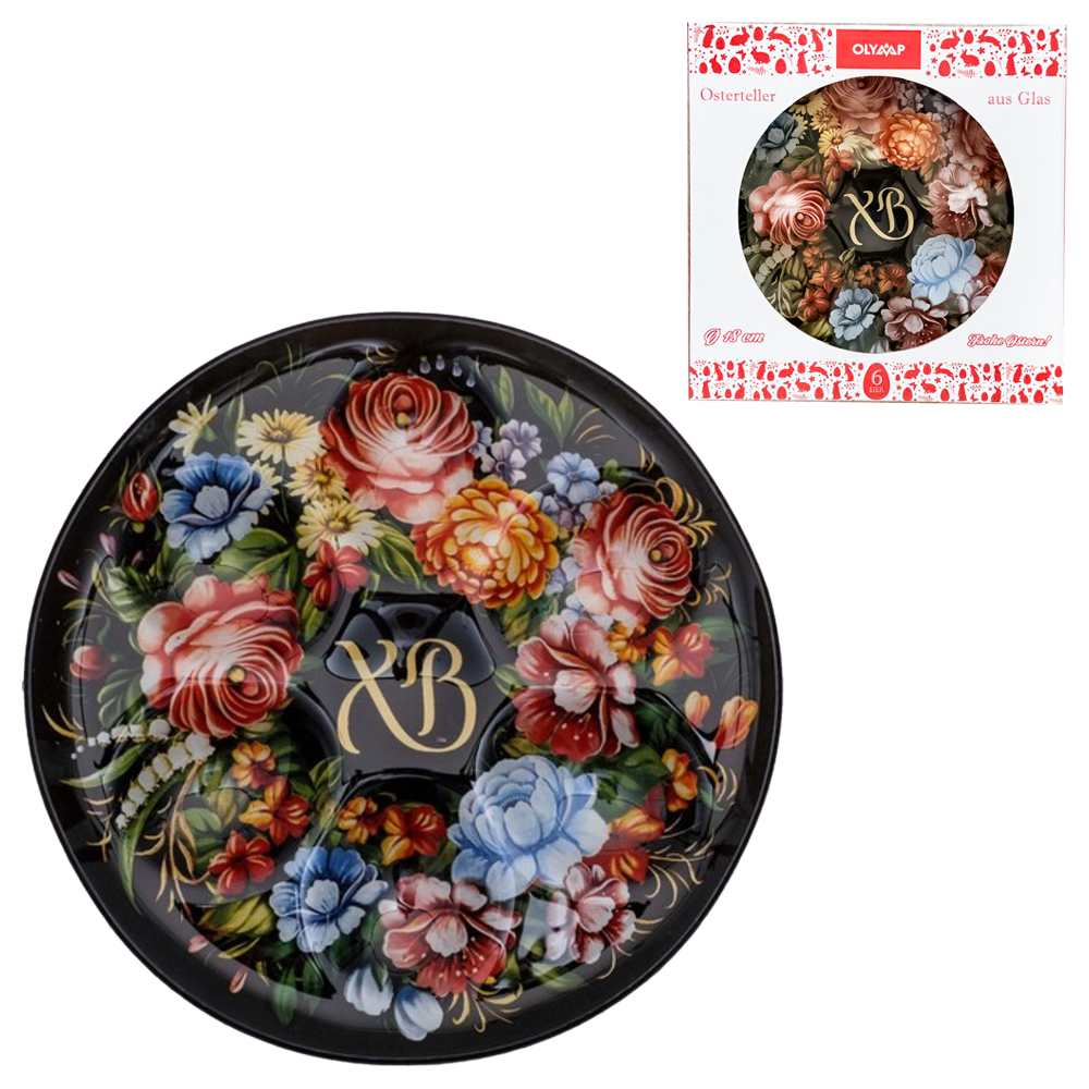 Dieser elegante Osterteller aus Glas vereint traditionelles Design mit edler Handwerkskunst. Mit einem Durchmesser von 18 cm und Platz für 6 Ostereier ist er perfekt für die festliche Osterzeit. Das wunderschöne florale Muster in kräftigen Farben auf schwarzem Hintergrund verleiht ihm eine besondere Eleganz. In der Mitte des Tellers prangt die traditionelle goldene Aufschrift „XB“ („Hristos Woskres“ – „Christus ist auferstanden“) – ein Symbol der orthodoxen Osterfeier.Eigenschaften: