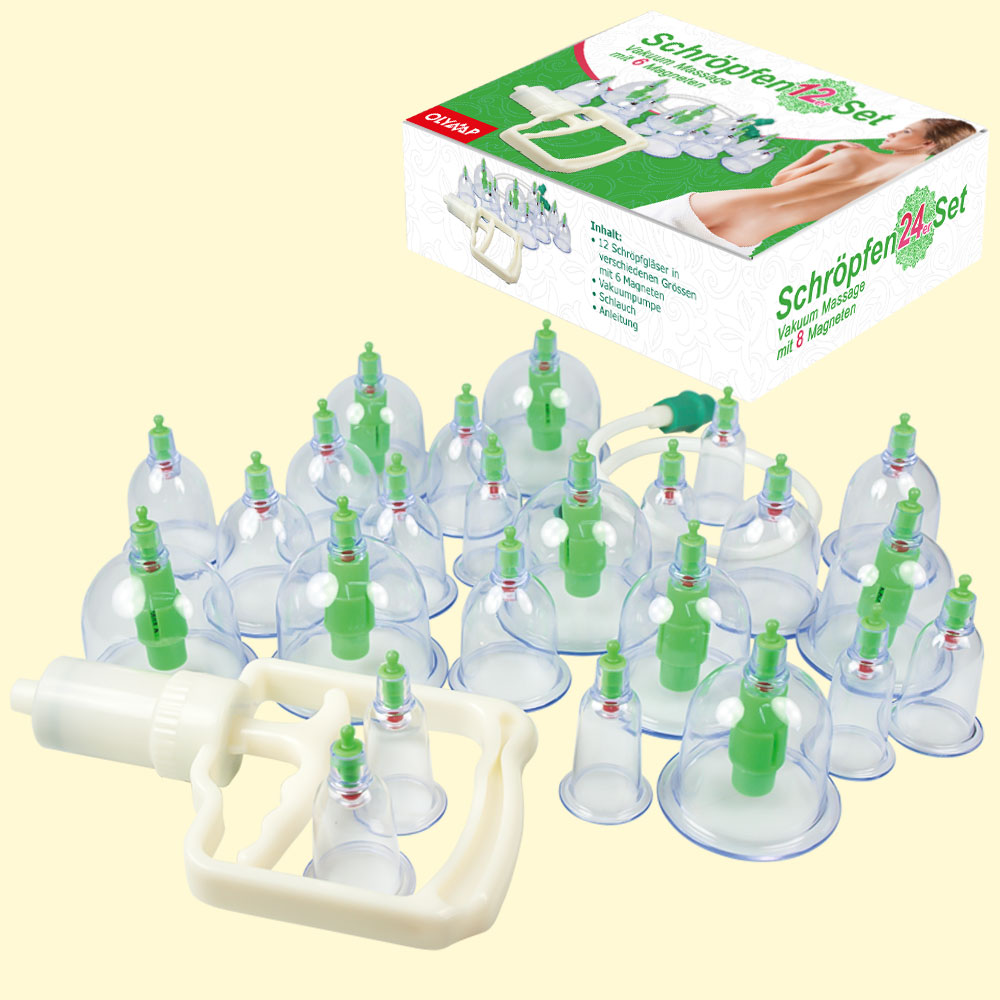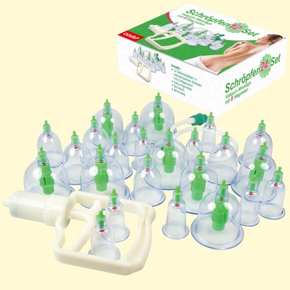 Schröpfen 24er Set für Vakuummassage, H-6 bis 8 cm, D-3 bis 6,5 cm, mit 8 Magneten