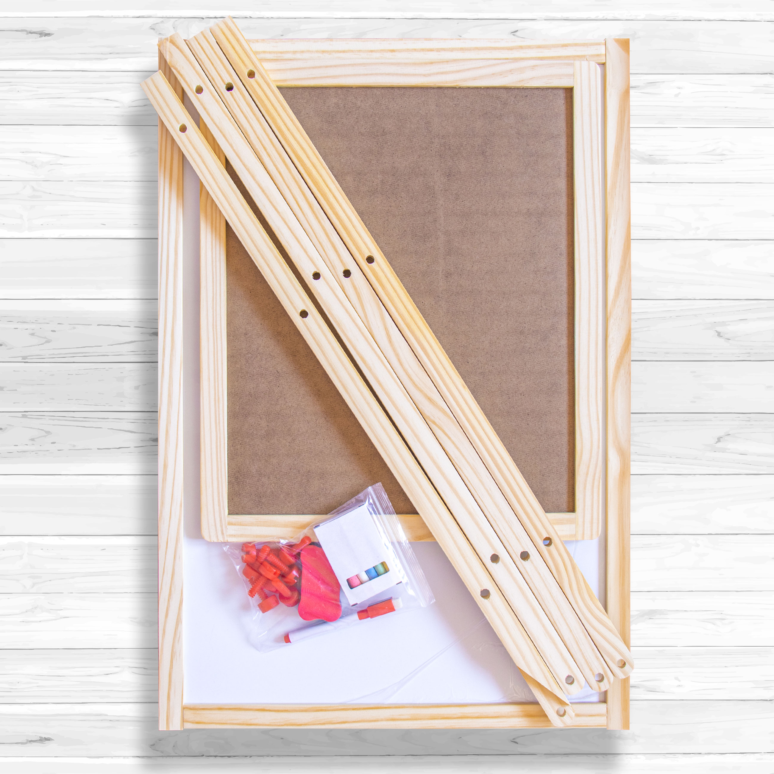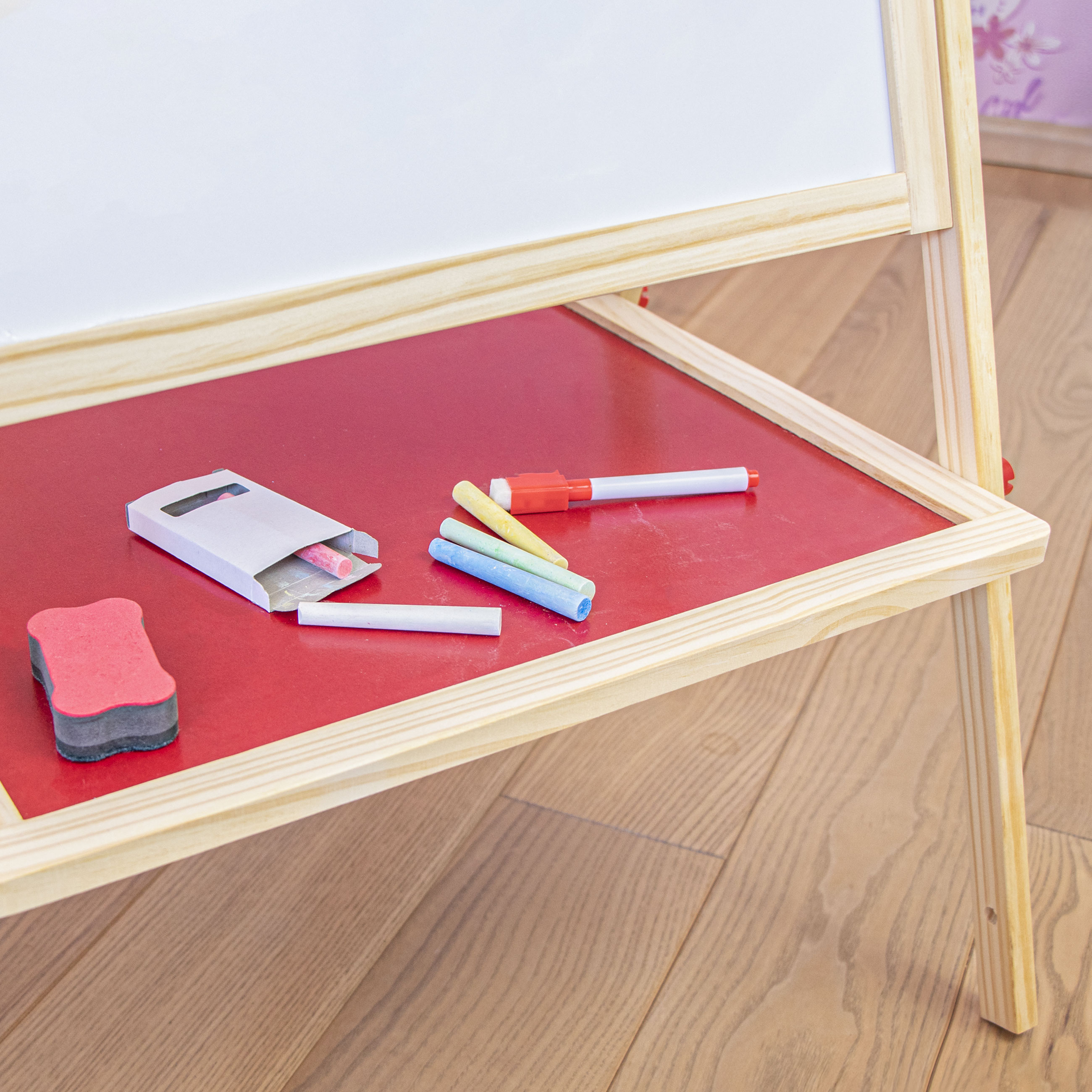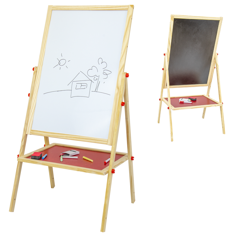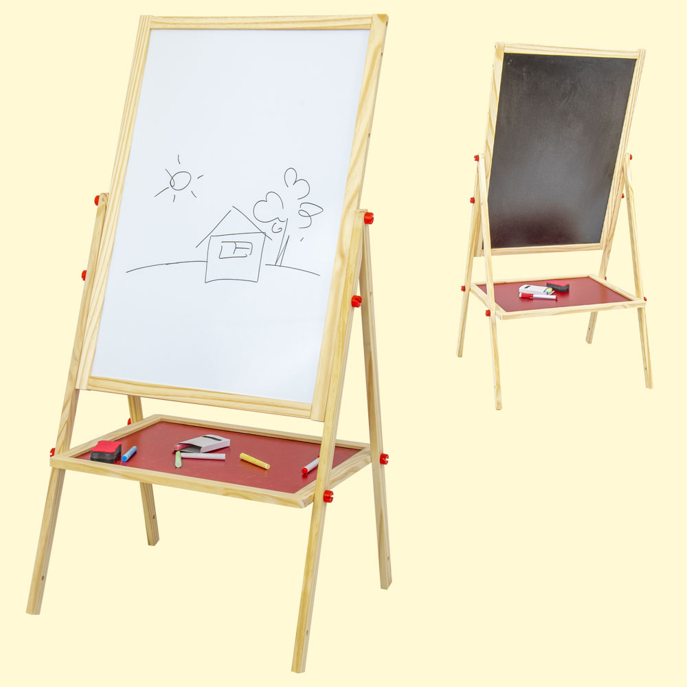 Die doppelseitige hölzerne Staffelei mit einem magnetischen Lernbrett ist ein gutes Geschenk für Vorschulkinder und für kreative Kindern unterschiedlicher Altersgruppen. Malen und gestalten wie ein echter Künstler! Wählen Sie nun den Hintergrund für Ihr Kunstwerk - eine schwarze oder eine weiße Tafel. Machen Sie einen gewöhnlichen Raum zu einer Kunstwerkstatt.