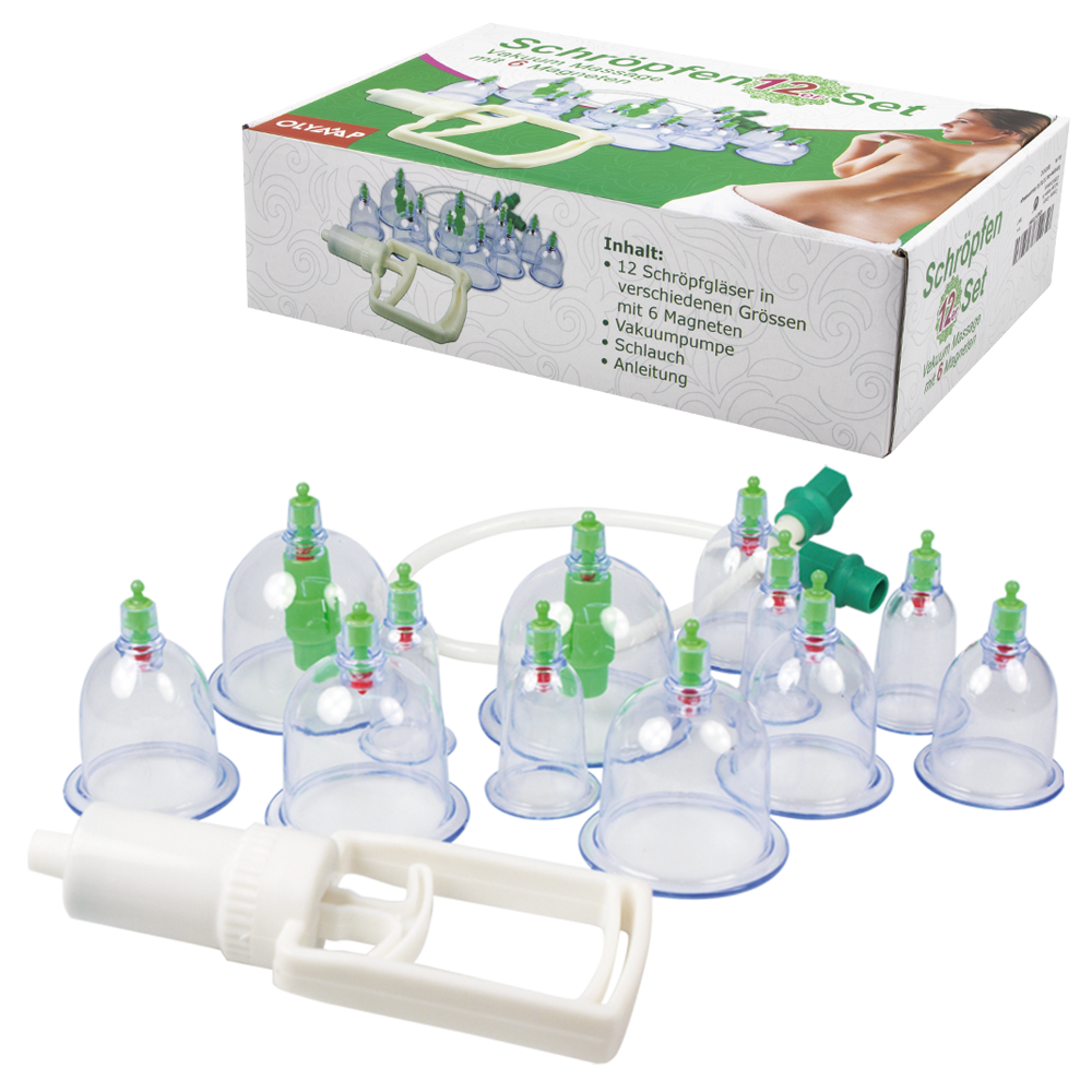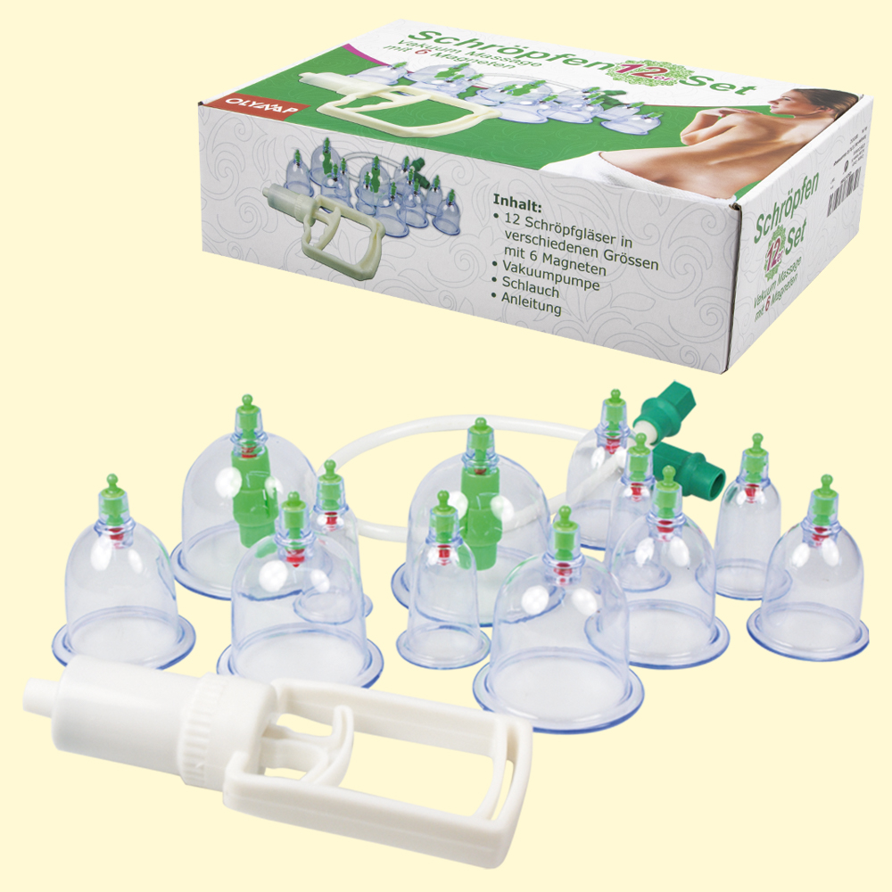 Schröpfen 12er Set für Vakuummassage, H-6 bis 8 cm, D-3 bis 6,5 cm, mit 6 Magneten