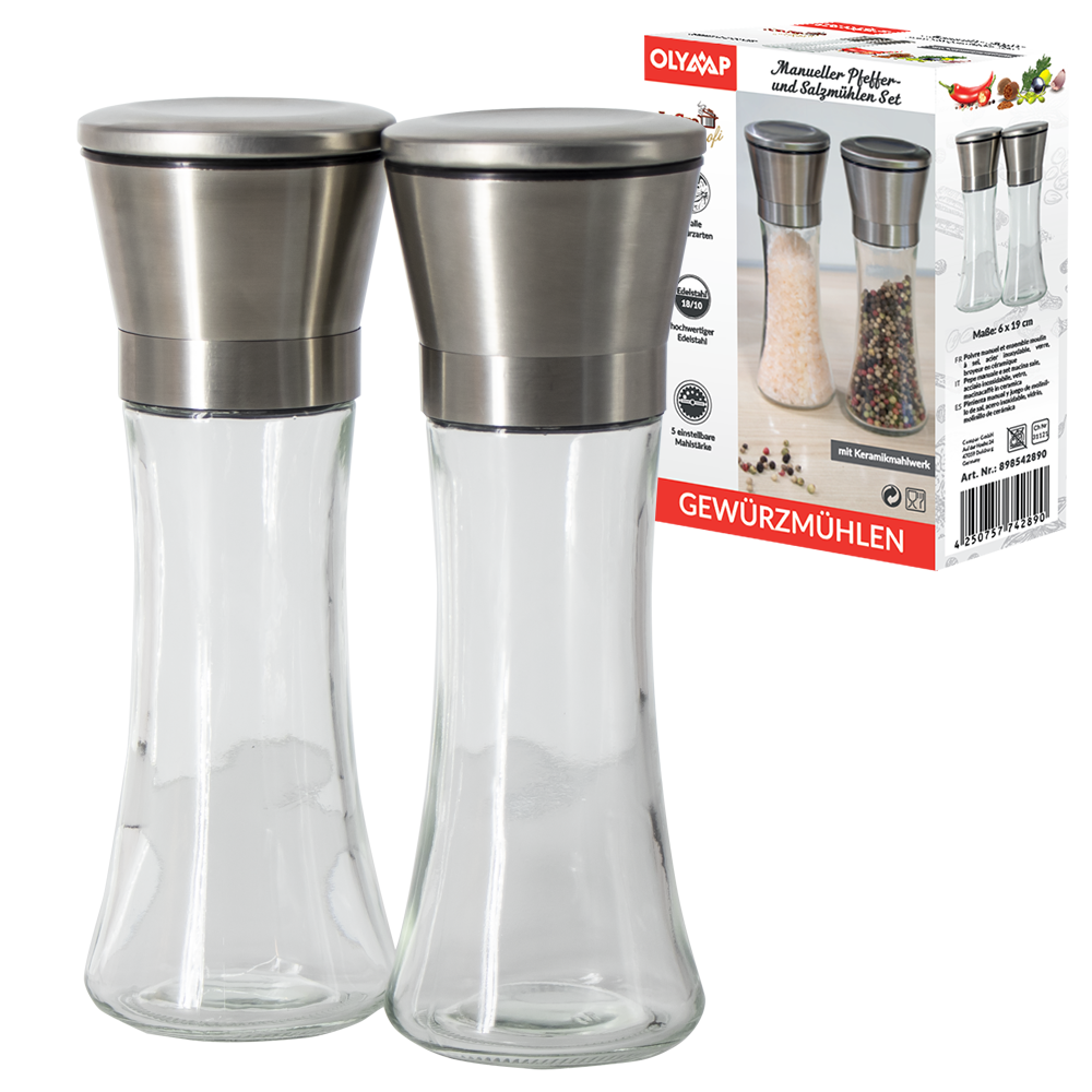 Pfeffer- und Salzmühlen Set aus Glas und Edelstahl