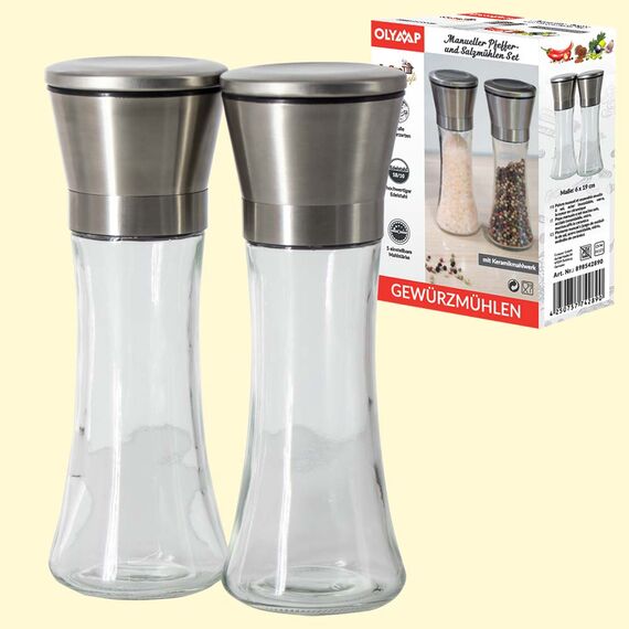 Manueller Pfeffer- und Salzmühlen Set aus Glas und Edelstahl, 19 cm