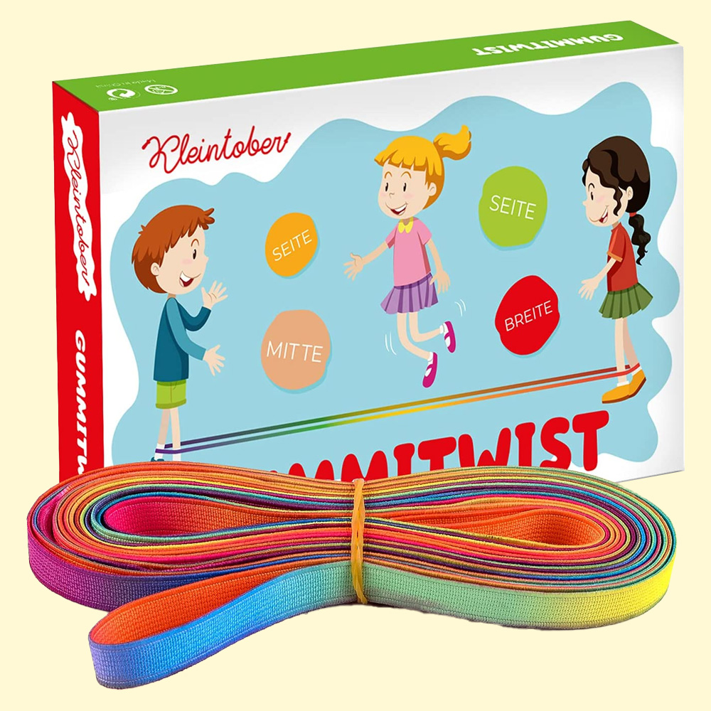 Hochwertig verpackt in einem qualitativen und auffälligem Farb-Carton, ist der KLEINTOBER Gummiband ein ideales Geschenk für jeden angehenden Hüpfer, ob für Mädchen oder Jungs. Draussen, drin oder auf Reisen. Ob alleine oder für bis zu 4 Hüpfern. Ob zu Ostern, zu Weihnachten, als Spiel für den Kindergeburtstag oder in die Schultüte: ein Geschenk, was garantiert lange in Erinnerung bleibt!