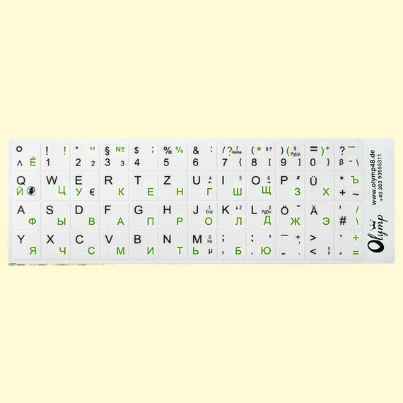 Unsere schwarz-grünen Tastaturaufkleber für Deutsch und Russisch auf weißem Hintergrund sind die perfekte Lösung für alle, die in beiden Sprachen arbeiten möchten. Diese hochwertigen Papieraufkleber sind so konzipiert, dass sie nicht abreiben oder mit der Zeit verblassen, was sie zu einer langlebigen Option für Ihre Tastatur macht. Die auffälligen Farben sorgen dafür, dass die Buchstaben gut lesbar sind und die Nutzung Ihrer Tastatur sowohl praktisch als auch stylisch bleibt.Eigenschaften: