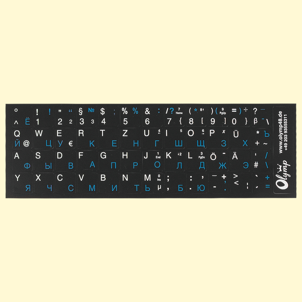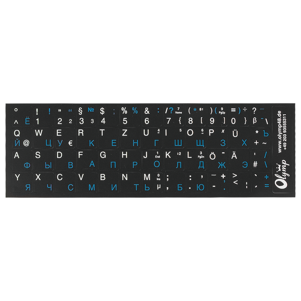 Tastaturaufkleber Deutsch-Russisch, weiß-blau, schwarzer Hintergrund