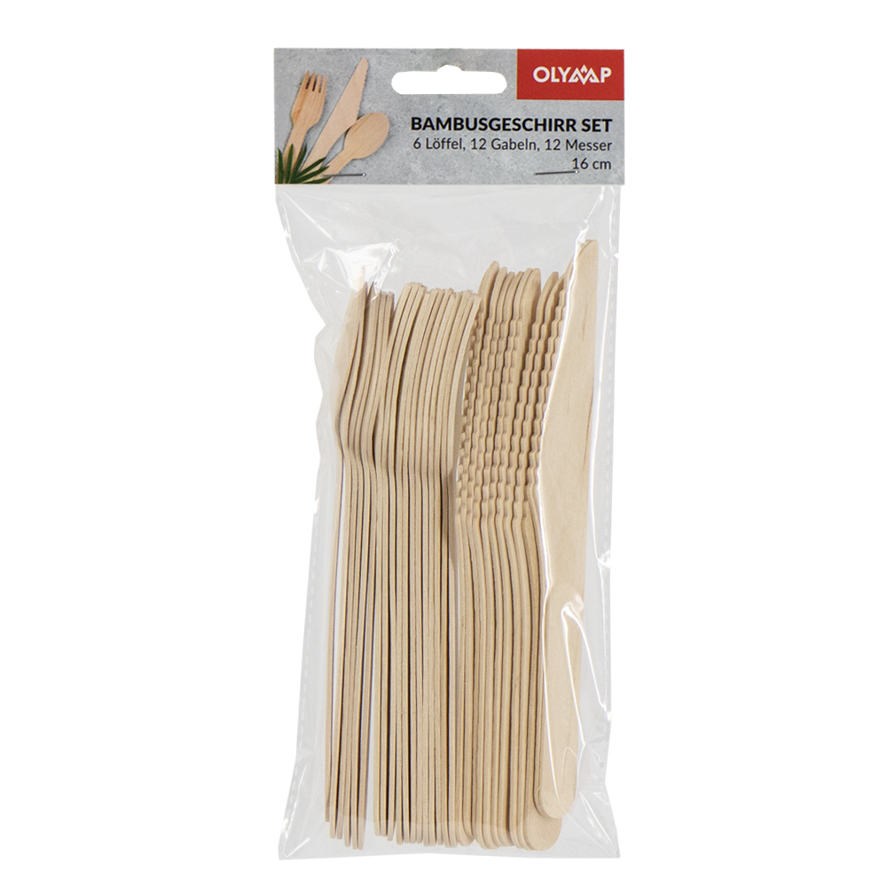 Olymp Einweg-Bambusgeschirr-Set 6 Löffel, 12 Gabeln, 12 Messer