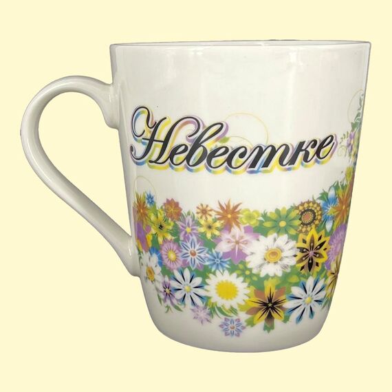 Diese elegante Tasse ist das perfekte Geschenk für eine geliebte Schwiegertochter. Sie ist aus hochwertiger Keramik gefertigt und hat ein Fassungsvermögen von 0,4 Litern, ideal für den täglichen Gebrauch. Der liebevolle Schriftzug „Невестке“ (russisch für „Schwiegertochter“) auf der Vorderseite, kombiniert mit einem farbenfrohen Blumenmotiv, verleiht der Tasse eine besondere persönliche Note.