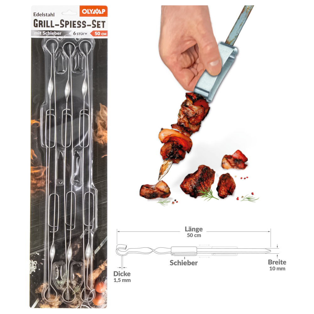 Olymp Grillspieß aus Edelstahl, 6 Stück, Länge 50 cm mit Schieber