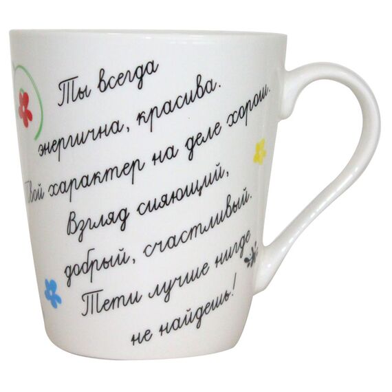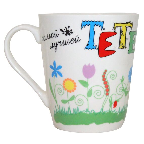 Der Becher ist aus umweltfreundlichem, hochwertigem Porzellan mit feinem Glanz gefertigt. Er hat ein attraktives thematisches Design in Form mit dem Schriftzug/Spruch auf russisch "Für die beste Tante".Dieser stylische Becher ist ideal für den täglichen Bedarf - im Büro oder Zuhause.