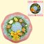 - Farbe: Rosa Rand, hellblaue Mitte, bunte Punkte, bunte Eier, gelbe Schleife