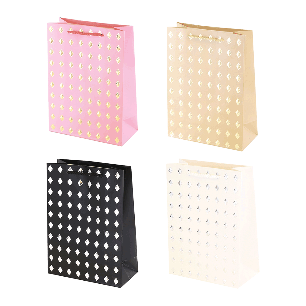 Das Geschenktaschen-Set umfasst 12 hochwertige Taschen in vier stilvollen Motiven. Die eleganten Designs mit geometrischen Gold- und Silberakzenten verleihen jeder Geschenkverpackung eine moderne und zugleich edle Ausstrahlung.Im Set enthalten sind vier Farbvarianten: Rosa mit Goldakzenten, Beige mit Goldakzenten, Schwarz mit silbernen Akzenten sowie Creme mit silbernem Muster. Die glänzenden Details sorgen für einen besonderen visuellen Effekt und machen die Taschen ideal für festliche Anlässe.