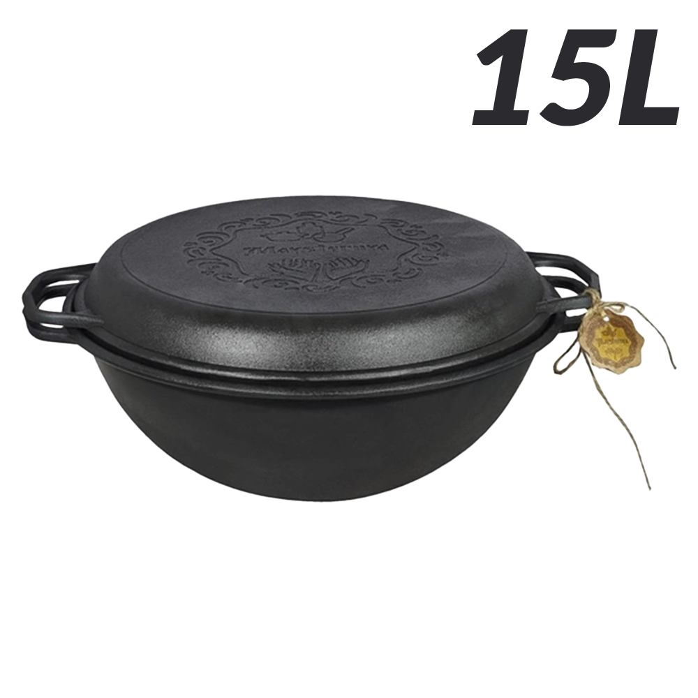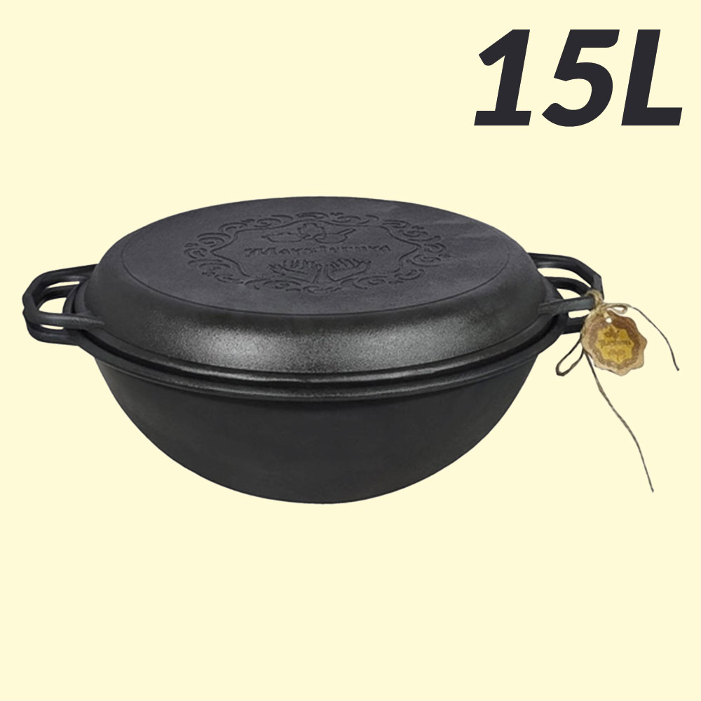 Uzbekischer WOK Kessel aus Gusseisen 15 Liter mit Pfannen-Deckel