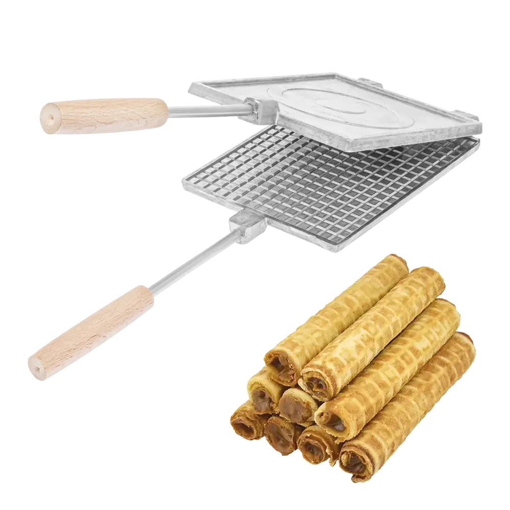 Die rechteckige Waffelbackform (19 × 14,5 cm) eignet sich ideal zum Backen von dünnen Waffeln, Tortenböden und ähnlichen Süßspeisen auf offenem Feuer oder dem Herd.